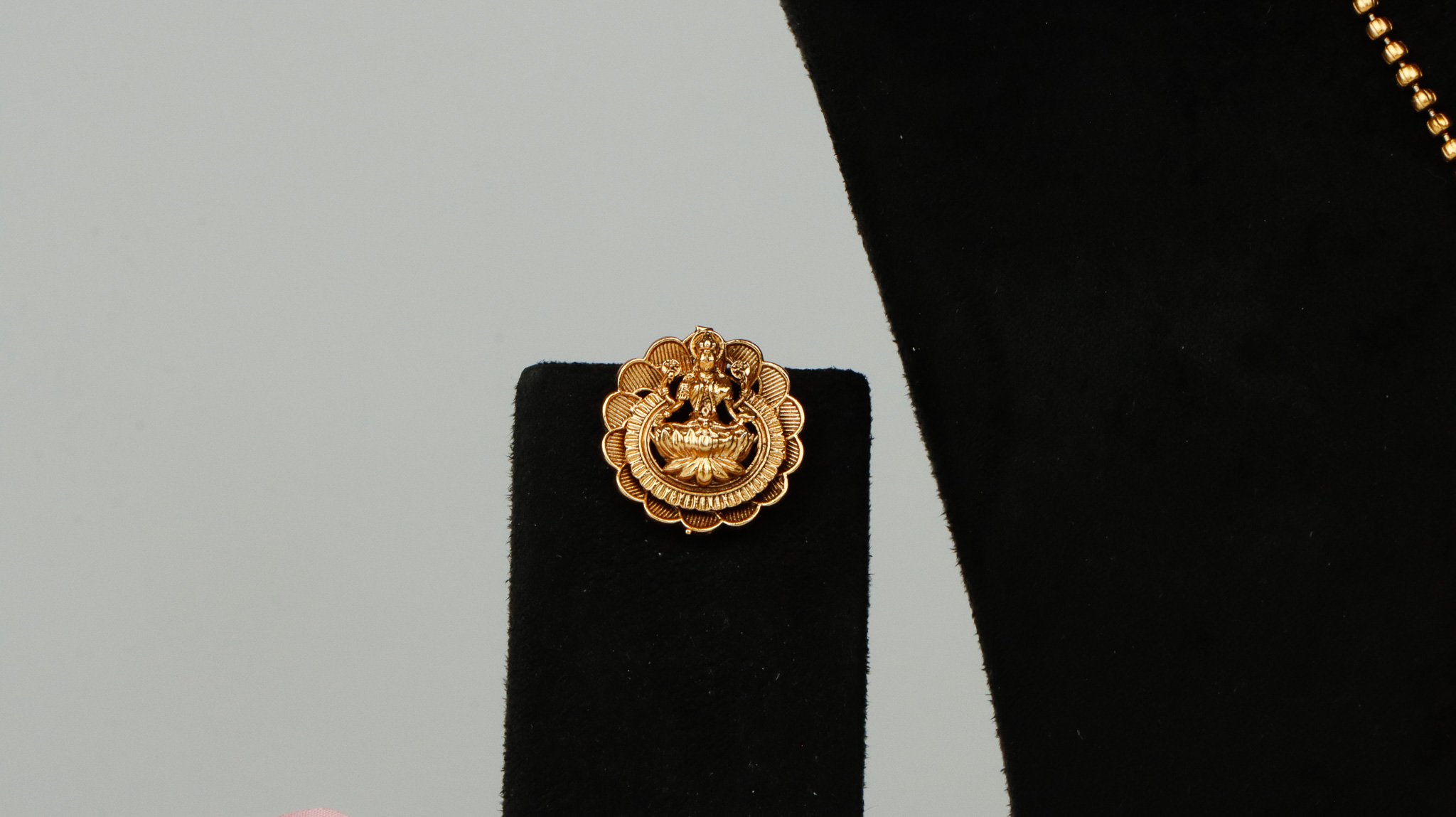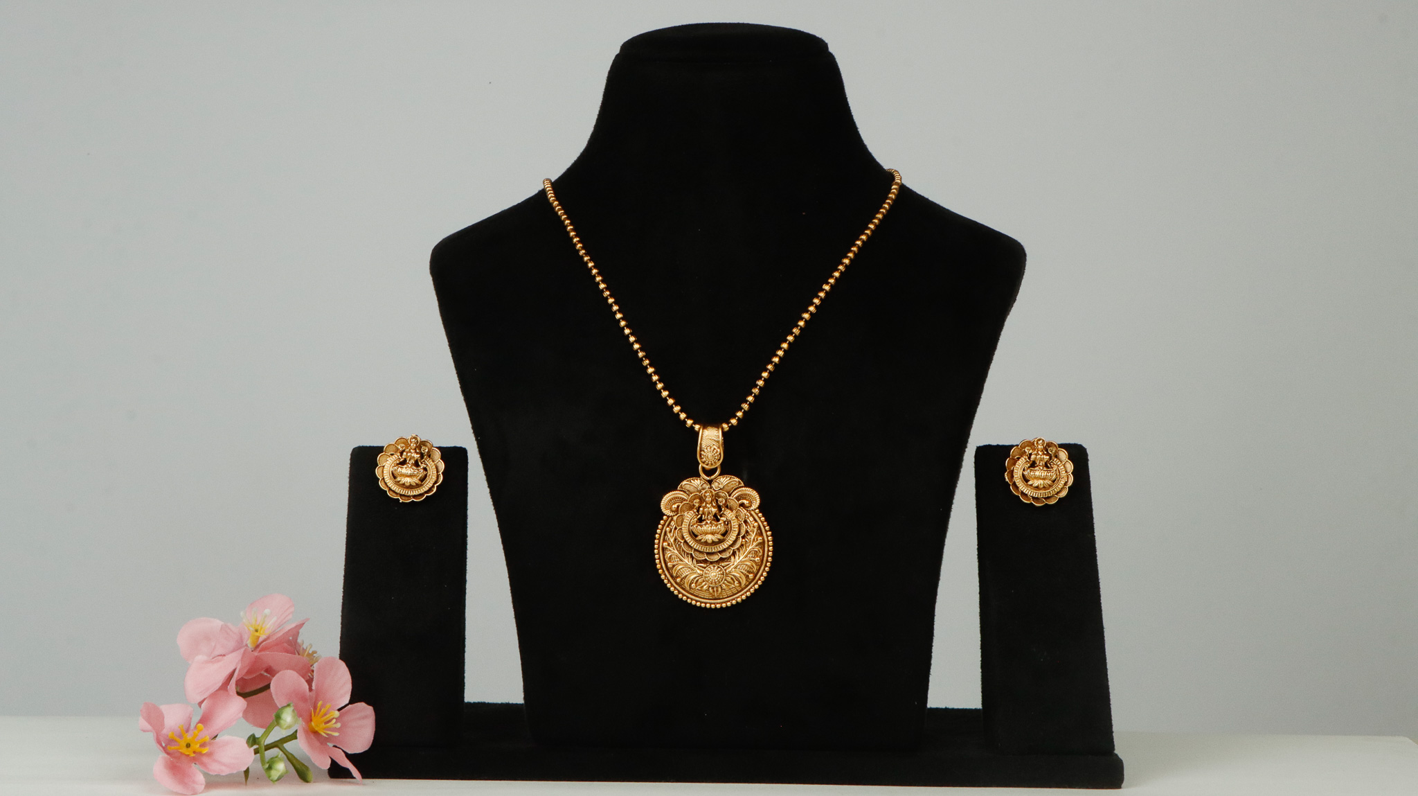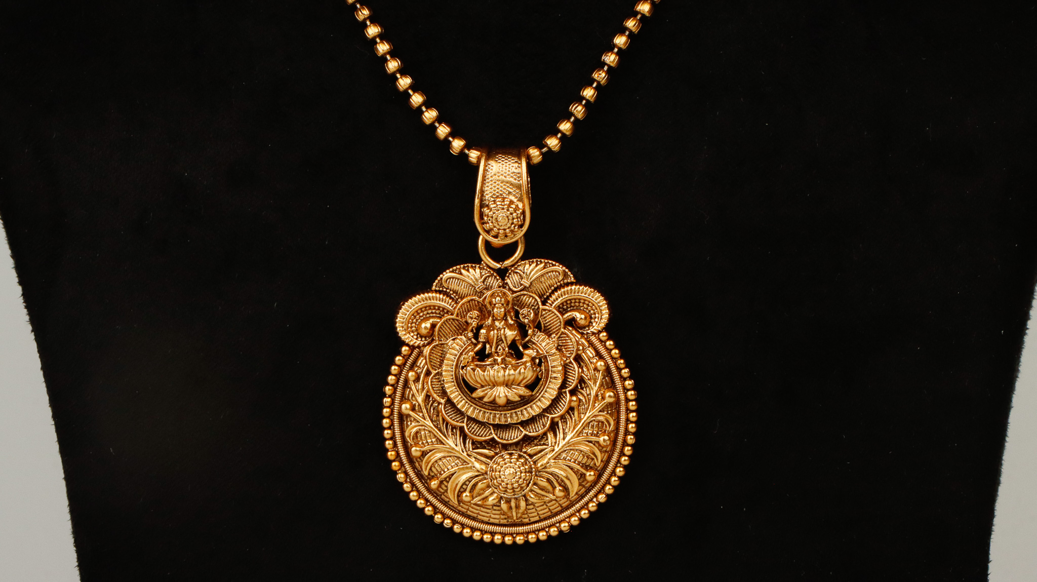 Laxmi designer pendant set with golden polish metal.